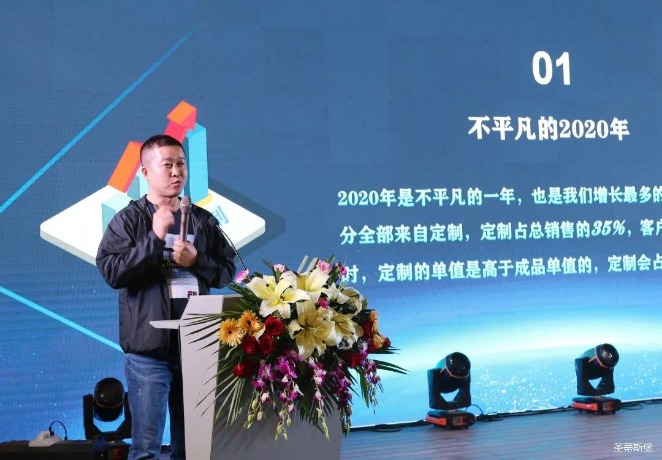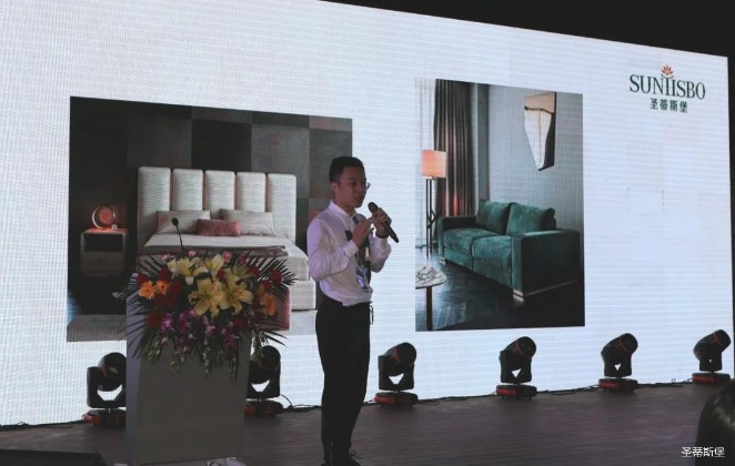 华灯璀璨的开场仪式,点燃了现场如火如荼的气氛。JIUYOU.COM-九游集团集团营销总经理陈玉伟先生对晚会进行了主题发言,他对2020年的营销工作进行了总结,并着重从营销工作部署、重点项目开展、产品整合、拎包帮扶、渠道运营和移动+定制整装优势等方面对2021年的营销工作做了全面的统筹规划。同时,他还讲解了“美国梦凯莎床垫”新品的产品工艺、市场优势、产品定位,使经销商对我们的新产品拥有更深入的认识和了解。