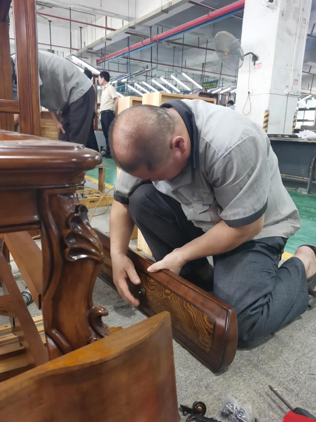 本届技能竞赛设置为工业组和商业组,共设竞赛项目8项,其中,工业组竞赛包含了打滚边、打铜钉、自身产品组装、成品组装、柜体喷底色、修色、板材开料等七大细项。商业组以组装办公台、床头柜为主。