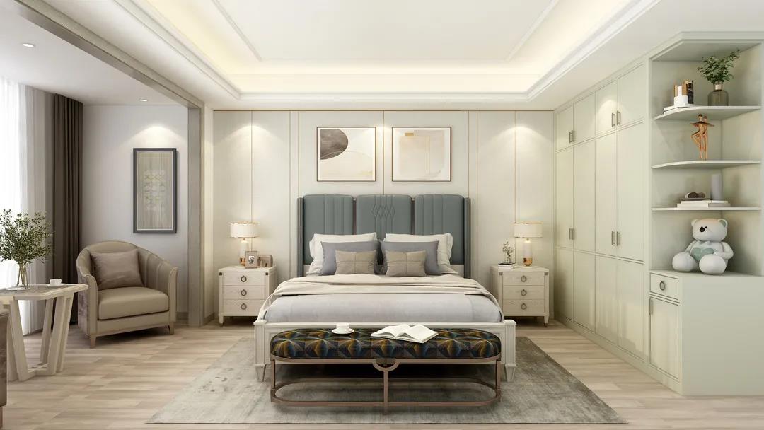 次卧背景墙两端是对称式设计,以淡雅的暖色为主,